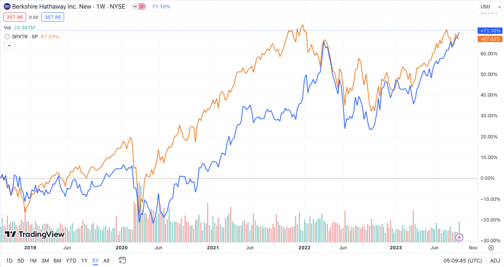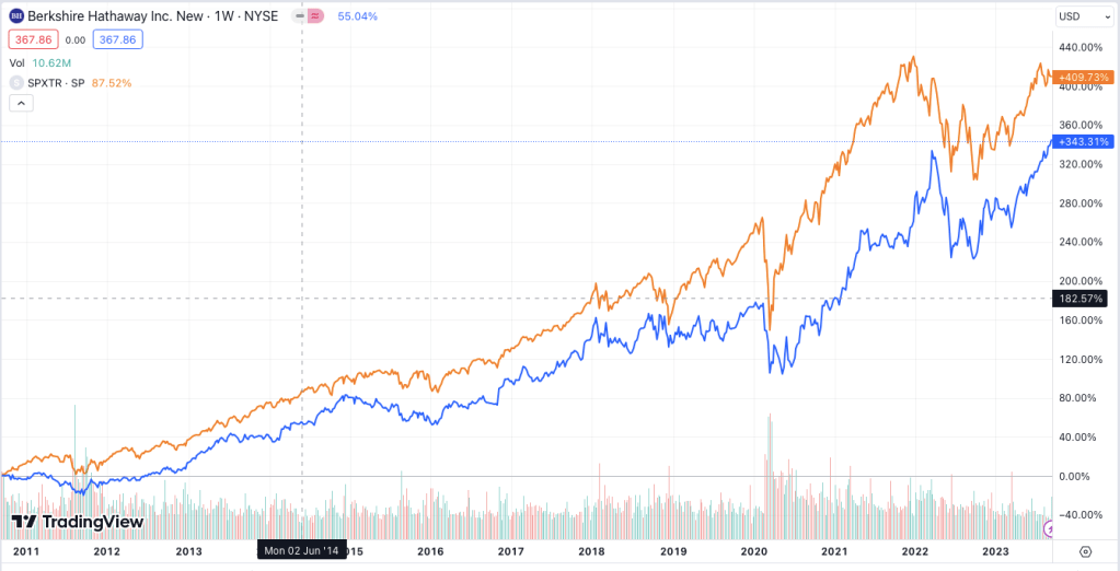 A tohle jsou výsledky od roku 2010, modrá linka je Berkshire Hathaway, oranžová Index.