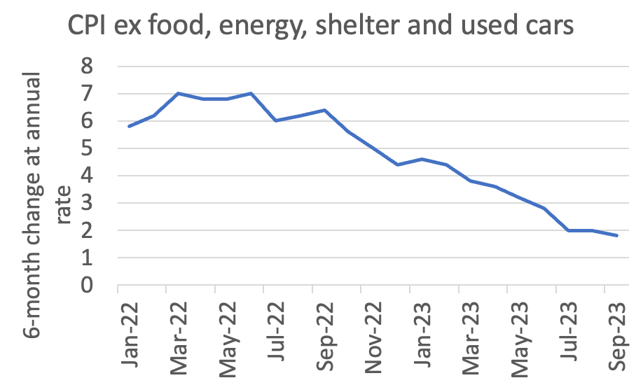 Co se jádrové inflace týče, po letních měsících, kdy se dostala na 0,2% mezimésíčně, začla opětovně růst a je podruhé za sebou na 0,3%. Hlavním potížistou se opět stává shelter – tj. náklady na bydlení, které v září znvu zrychlily k 0,6%. Vzhledem k tomu, že shelter je největší položkou v indexu spotřebních cen, tak se jedná o podstatný faktor inflace. Náklady na bydlení mají velmi dlouhé zpoždění vůči změnám trhu s bydlením a na začátku stála právě tato prodleva za omylem s teorií o dočasné inflaci. Trh s bydlením přitom výrazně ochladl a je tedy možné očekávat, že i inflace nákladů na bydlení půjde postupně dolů, a to by mělo dále utlumovat jádrovou inflaci. Má však Fed vyhráno? Zjevně nikoliv. Jádrová inflace ve vyšších jednotkách procent zjevně nehrozí, ale dostat inflaci ke dvěma procentům nebude jednoduché, o celkové inflaci nemluvě.