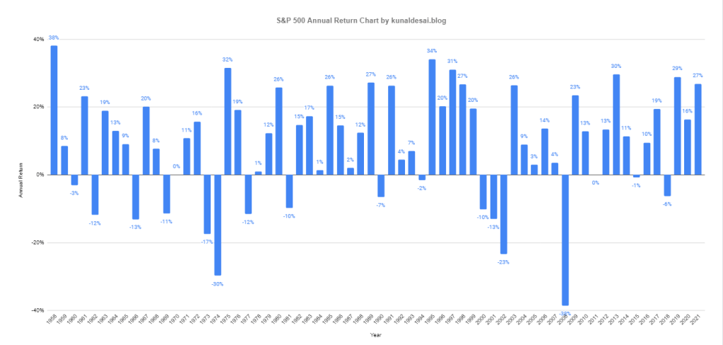 Tento graf ukazuje roční zisky/ztráty SP500 v jednotlivých letech od roku 1958. Prvních 10-15 sloupců tím pádem ukazuje prostředí, kdy sazby nejdou směrem dolů, ale opačně. Z grafu to není zcela jasně vidět, ale průměrný výnos indexu v období rostoucích sazeb je výrazně nižší s velmi vysokou volatilitou směrem dolů, než by odpovídalo celkovému průměru. Naopak 90. roky a nové tisíciletí jsou období, kde vyjma několika vyloženě špatných let, se na indexu peníze neprodělávaly.