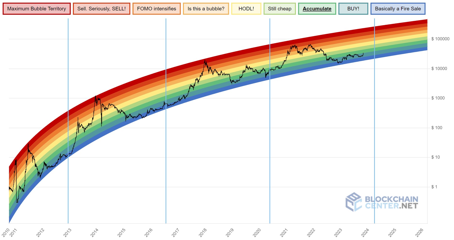 Pro orientaci v bitcoinovém cyklu používám už několik let tenhle meme duhový graf bitcoinu, který sice zpětně vypadá geniálně, ale faktem je, že autor kontinuálně upravuje sklon duhové funkce, aby mu graf nevylézal z duhy, což se například u minulého cyklu přesně stalo. Tak jako tak, jedná se o poměrně slušný ukazatel toho, kde zrovna v cyklu jsme. A to, v čem se shoduji já i graf, je fakt, že pokud si chcete vsadit na další bitcoinový cyklus (a mánii v mediích ohledně jeho ceny, iracionalitu na trhu a všechny ostatní průvodní jevy extrémního růstu ceny bitcoinu), tak teď je jedna z posledních příležitostí. Nad 40tis USD už bude riziko, že nezvládnete na bitcoinu vydělat, extrémně vysoké.