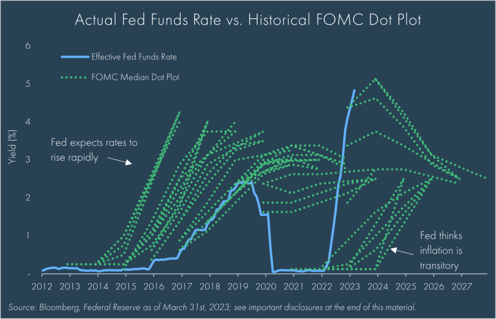 Fed má nicméně jednu zajímavou tendenci, kterou lze vidět na historických datech. Je reaktivní, takže chodí se džbánem pro vodu tak dlouho, dokud se ucho neutrhne. Krásně to ilustruje následující graf. Modře je reálná sazba Fedu a zeleně je predikce sazby v historii. Je naprosto evidentní, že do roku 2020 Fed projektoval na dot plotu vždy mnohem agresivnější utahování monetární politiky, než byl schopen ve skutečnosti dodat. To samé opačně, snížení sazeb v covidu přišlo nečekaně. Do třetice tomu Fed nasadil ve výhledech korunu, když nereagoval na rostoucí inflaci (u které držel Fed přízvisko temporary) a původní projektované utažení monetární politiky bylo predikováno na roky 2023-2024.