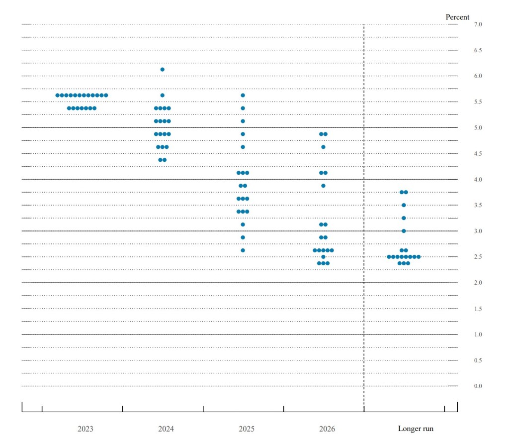V tabulce výše jsou slíbená data ze CME futures. Vidíme jednak velmi silné přesvědčení, že zhruba půl roku se Fed rate hýbat nebude. Následně, v druhé polovině roku je očekáván pokles o 100bps ze stávající úrovně. Oproti tomu si pro kontext můžeme ukázat dot chart z posledního zasedání Fedu, které bylo 20. září 2023. Vidíme data ke konci roku 2023 a konci roku 2024. U roku 2023 Fed predikoval jedno zvýšení sazeb nad stávající úroveň, následně na konci roku 2024 pak snížení zpět o 50bps na hranici 5%. Dot chart není závazný a samotná predikce může plnit politické cíle.