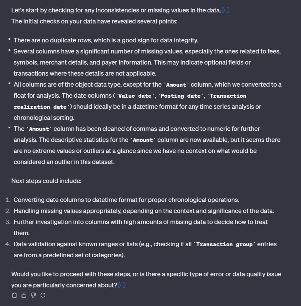 ChatGPT v tento moment funguje jako agent. Nejen, že je schopen data textově analyzovat, ale dokáže s nimi i pracovat a následně Ti dokument vrátit opravený. Může následně udělat i vizuální analytiku dat. Nevím jak dlouho tyto vlastnosti placené GPT-4 má, ale je schopno vykonávat kancelářskou činnost s vysokou mírou efektivity. Viz níže, výstup Open AI po nahrání csv dat z banky k čištění:
