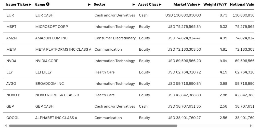 Tohle je jediné ETFko, které mám v portofliu, proto mě zajímá nejvíc. Je navázané na index, který asi nejblíže reflektuje investiční tezi Berkshire Hathaway – nakupovat kvalitní firmy za dobrou cenu. Index je postaven ze dvou třetin na value faktoru (především Price to Book Value, ale i další kriteria) a z jedné třetiny quality faktoru (hlavně zadlužení a ziskovost).
