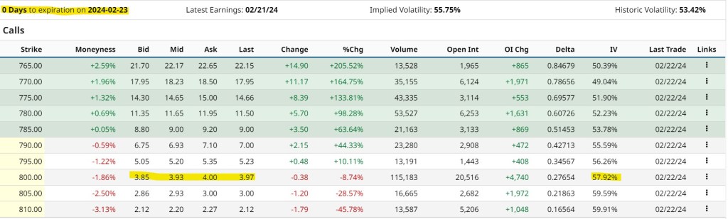 Toto je cenik call opcí po zavření burzy včera, tzn. jeden den po zveřejnění výsledků a 24 hodin do expirace. Cena akcie po vysledcích prudce vyletěla vzhůru. Jeden obchodní den po výsledcích cena akcie vrzostla z 670 USD na 785 USD. V době snímku tabulky byla tržní cena akcie 15 USD pod mým strikem.