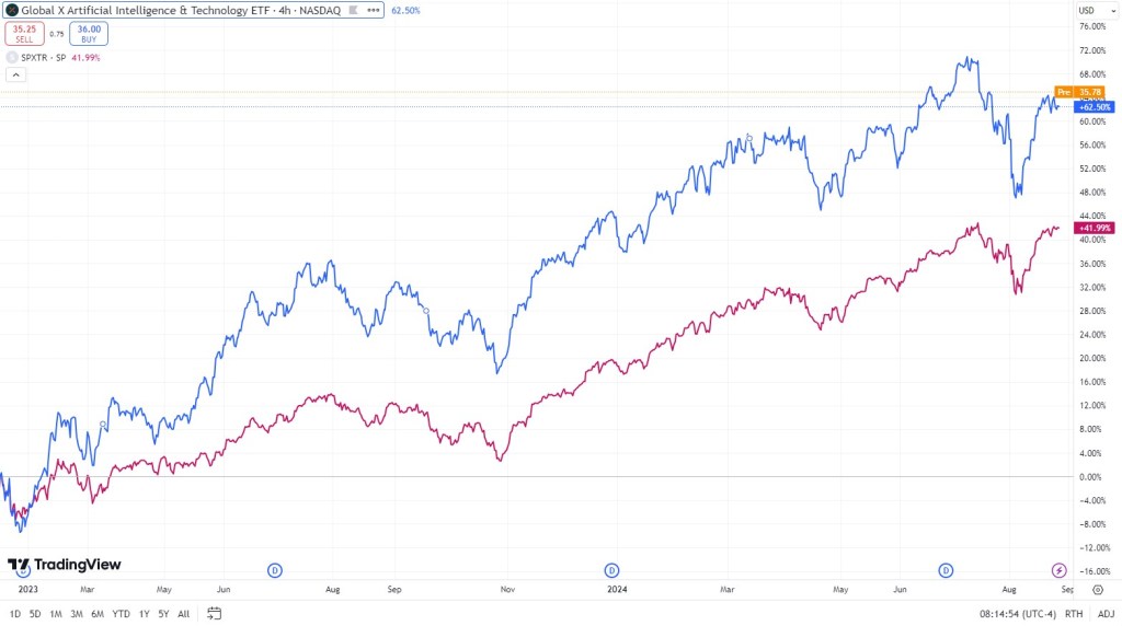 Použiju zase oblíbený Global X, který má fond AIQ. Ten sice existuje už od roku 2015, což není úplně relevantní (underperformance v daných letech pochopitelně), pojďme ale kouknout na jeho výkonost od konce roku 2022, kdy se objevil ve veřejném prostoru chatGPT.