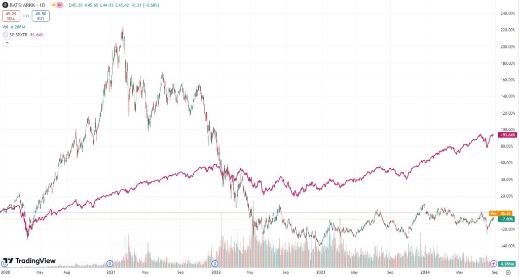 ARK Innovation ETF – fond založený koncem roku 2014, obrovskou popularitu nabral v covidu. Chvíli to sice trvalo, ale statistika k dnešnímu dni je neúprosná. Výnos SP500 včetně reinvestovaných dividend je k dnešnímu dni od založení etf +234%, ARKK má +122%.