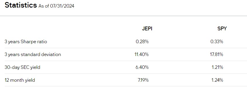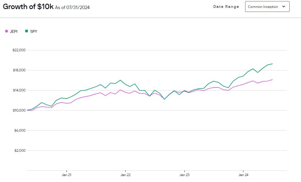 Jedním z nejpopulárnějších fondů je aktivně spravovaný JP Morgan Equity Premium Income ETF, založený v roce 2020. Pod správou má už 35!mld USD, benchmarkem je SP500 index, web fondu zde. Pro srovnání, aktiva v nejznámějším indexu na světě SPY jsou 550mld, popularita derivative income fondů je na alternativní investice obrovská. Vzhledem k tomu, že má čtyřletou historii, je možné se podívat na nějaká data.