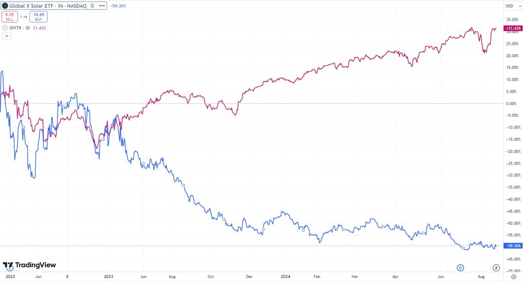 Global X – Cathie Wood z předchozího příkladu se musí uznat jedna věc, konzistentně opakuje to samé dokola roky a i když to k ničemu moc nevede, tak aspoň (zatím) nezmizela z trhu. Global X je správce, který mnohem víc připomíná exit scam. Na vrcholu nějakého trendu otevřou ETFko, to velmi často ztratí většinu svojí hodnoty a pak je v tichosti zavřeno. V době energetické krize byli hodně populární zelené zdroje energie. Není tedy divu, že Global X v roce 2022 otevřel fond solárních firem. Načasování bylo bezchybné… Asi rok jste si mohli připadat, že vlastně dobrý.