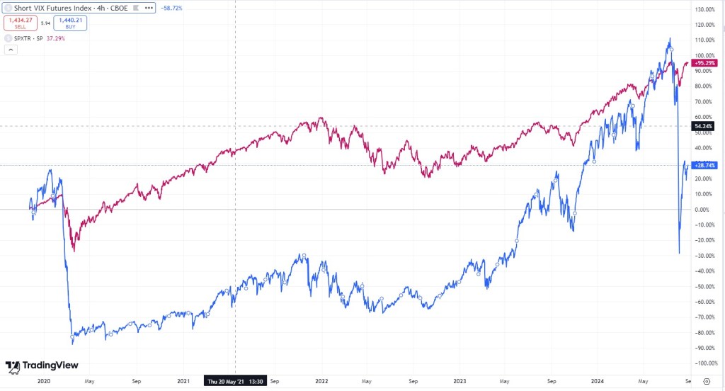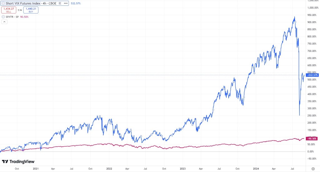 Deriváty na volatilitu mají ještě jednu legrační vlastnost. Protože volatilita je vztažena vždy k nějakému určitému datu v budoucnu, pokud ji obchodujete, čím více se daný den blíží tím více volatilita klesá. A právě na této vlastnosti je postavena strategie jejího shortování. Spekulujete na pokles volatility a obnovujete neustále pozice. To generuje stabilně výnos. Akorát pak jednou za pár let smažete účet. Na shortování volaility je i hezký index (konkrétní ETFka jsou na tom hůř, protože nesou náklady za rollování pozic atd.).